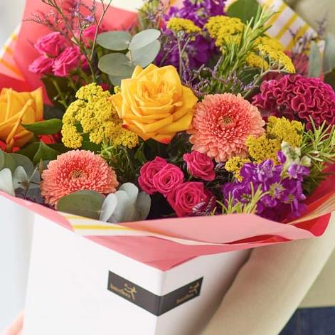 A vibrant bouquet of gorgeous fresh and bright flowers, expertly arranged by a skilled local florist. It could feature hot pink flowers, or blooms in shades of fiery orange or rich yellow. It all depends on what’s fresh and the occasion – every bouquet is beautifully unique.