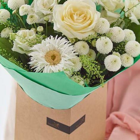 A gift box filled with calming neutral flowers in shades of crisp white and smooth cream, exquisitely arranged with with contrasting fresh green foliage by a local florist. The florist will chose the best blooms on the day so it may look different to the one shown.