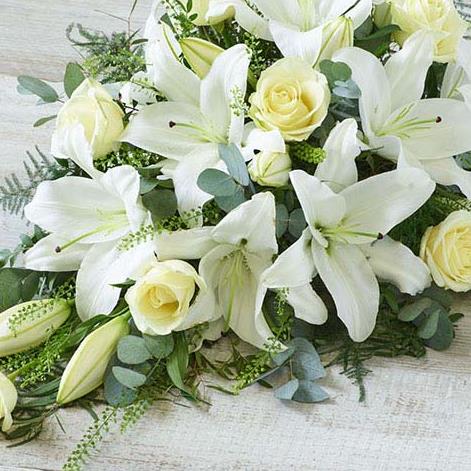 An elegant tear drop shaped arrangement featuring delicate foliage and large fragrant oriental lilies, combined with gorgeous roses.